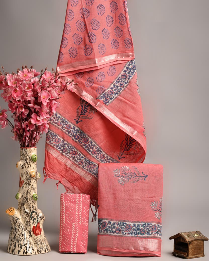 Experience the artistry of Bagru hand block printing with this exquisite linen cotton suit set. Crafted with precision, the set includes a top, dupatta, and bottom piece, each showcasing intricate blue floral motifs. The linen cotton fabric offers a lightweight and comfortable feel, perfect for all-day wear. Adorned with a silver border, this set exudes traditional charm and elegance.
