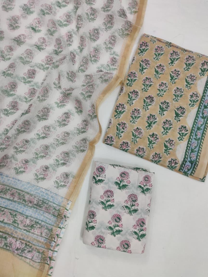 Rooted in the rich tapestry of Indian textile traditions, this enchanting fabric set embodies the delicate interplay of soft blush and vibrant floral motifs. Artisan-crafted with attention, each piece reflects the beauty of hand block printing, creating a canvas that speaks to both heritage and modern elegance.