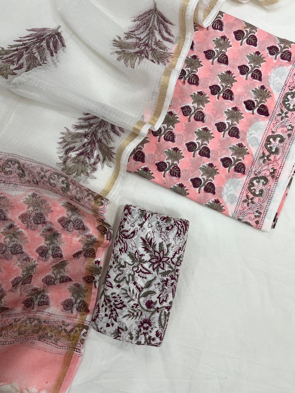Discover a celebration of craftsmanship with our Blush Floral Cascade Cotton Dress Material. This exquisite ensemble brings together the delicate artistry of hand block printing with a gentle palette of soft pinks, deep burgundy, and muted olive greens, creating a visual symphony that captivates and charms.