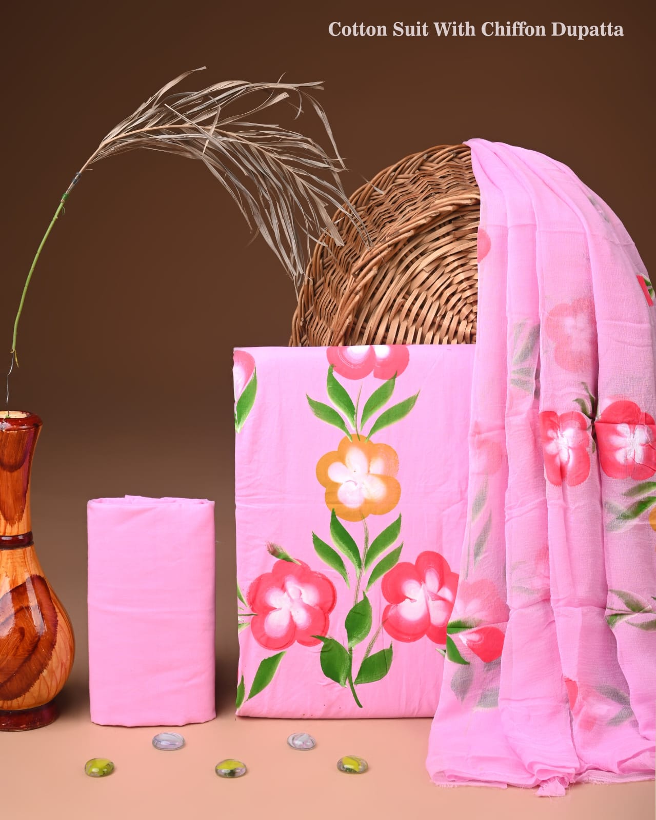 In a world filled with fast fashion, finding an ensemble that truly resonates with your love for tradition can be challenging. This exquisite cotton suit set offers a refreshing touch of artisanal charm, crafted from soft cotton that feels gentle against your skin. The delicate floral print in shades of crimson and sunny yellow blooms against a soft pink backdrop, creating a lively yet elegant appeal that brightens up your wardrobe.