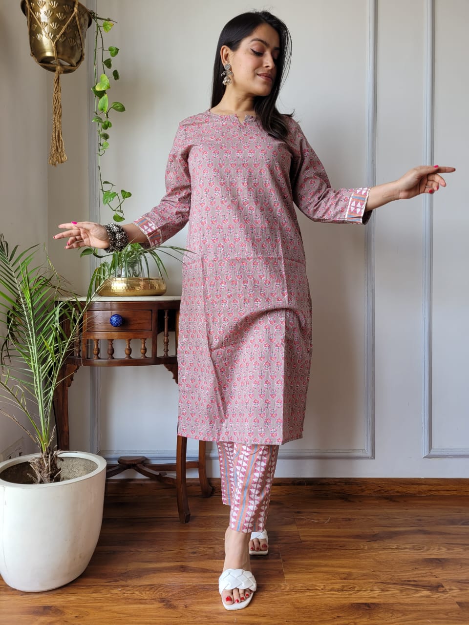 Embody the spirit of traditional artistry with our Blush Floral Elegance Cotton A-Line Kurti paired with stylish pants. This enchanting set features a gentle blush pink canvas, adorned with intricate floral motifs in deep crimson and muted teal, complemented by delicate accents of ivory and light mustard.
