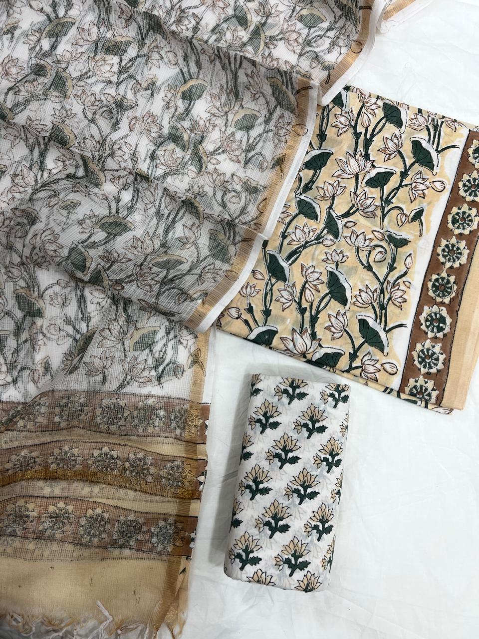 Indulge in the serene charm of our Blush Floral Elegance Cotton Dress Material. This exquisite ensemble is a celebration of hand block printing, where each floral motif springs to life, capturing the essence of Indian craftsmanship. The gentle blush of the flowers and the deep greens of the leaves create a harmonious balance against the soft beige backdrop, perfect for those who appreciate the art of textiles.