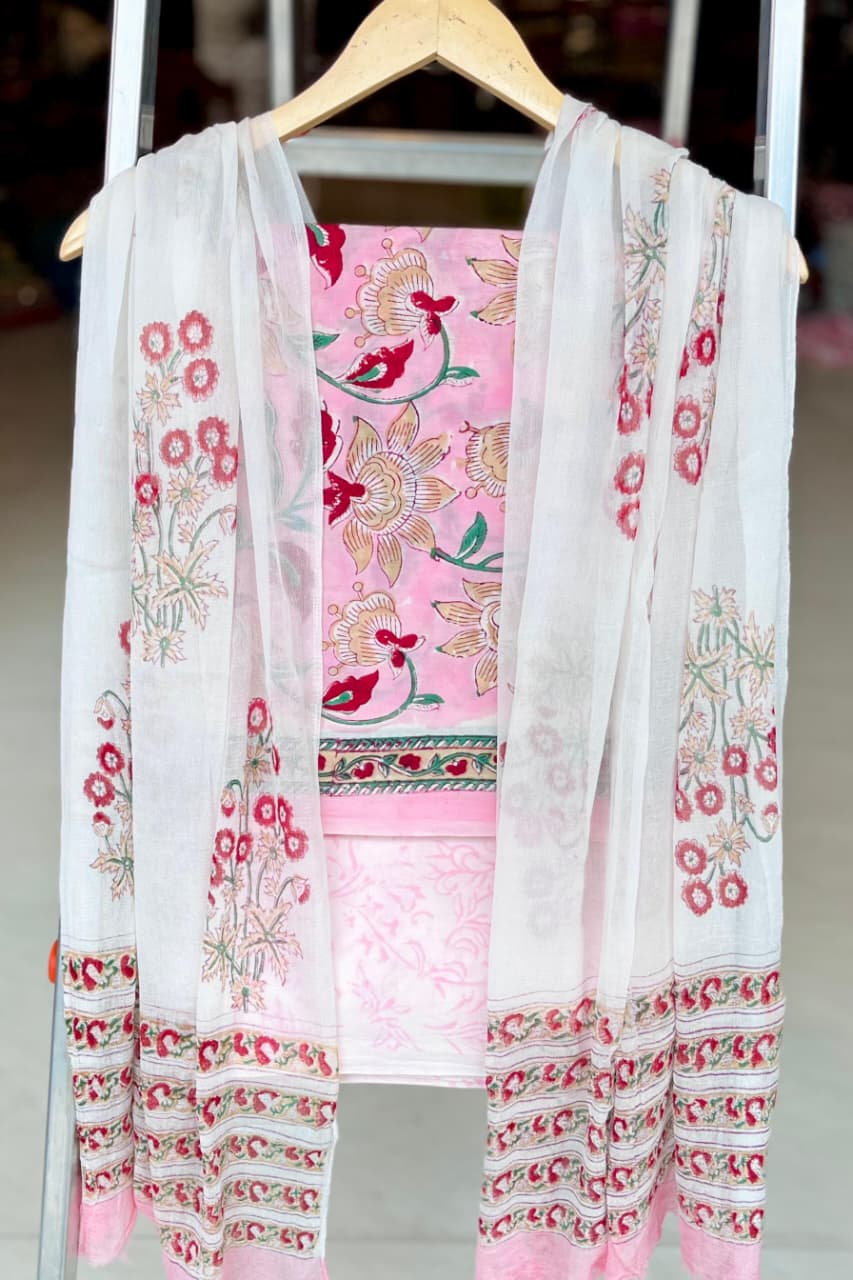 Drawing inspiration from the delicate beauty of nature, this blush floral symphony cotton dress material showcases a harmonious blend of soft pink hues adorned with intricate floral motifs. Each piece is artisan-crafted, reflecting the rich traditions of Indian block printing with careful attention to detail.