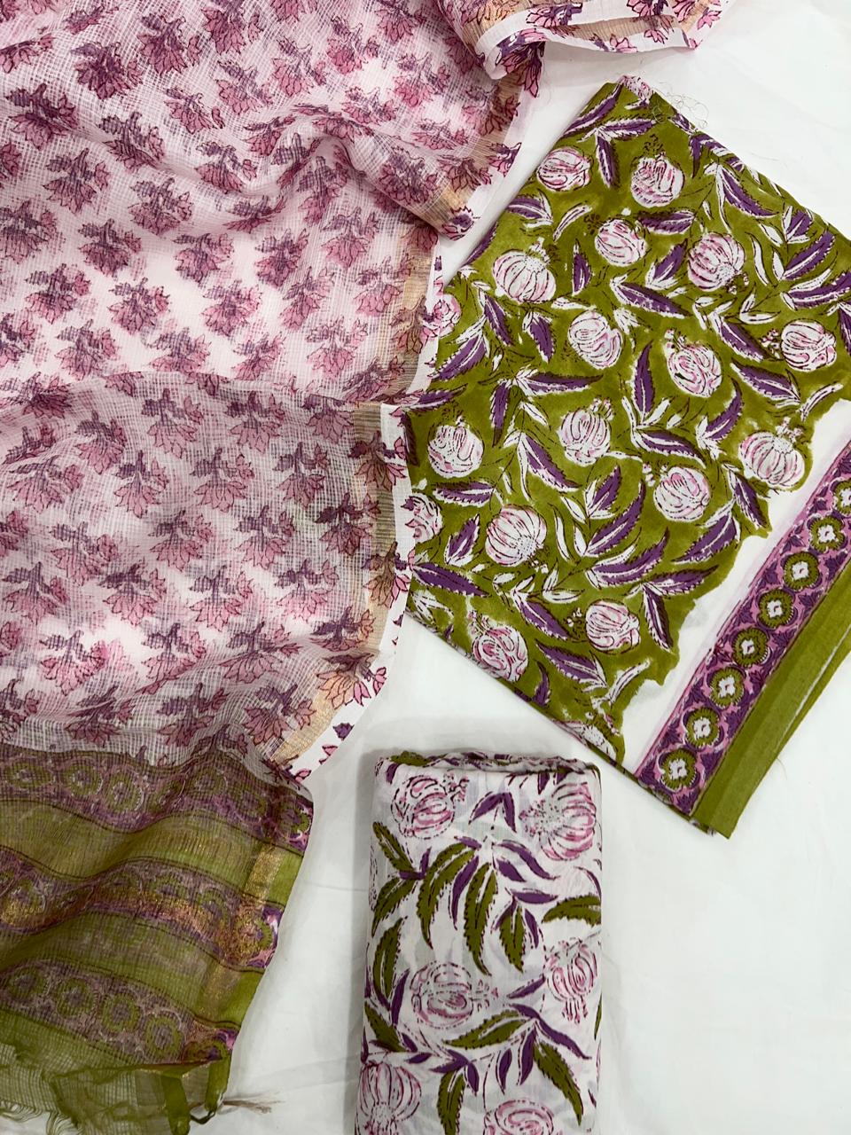 Crafted with meticulous care, our Blush Floral Whimsy Cotton Fabric Set showcases the enchanting motifs of nature intertwined with the heritage of Indian craftsmanship. The delicate floral designs bloom against a soft blush background, while the olive green accents breathe life into every yard of fabric.