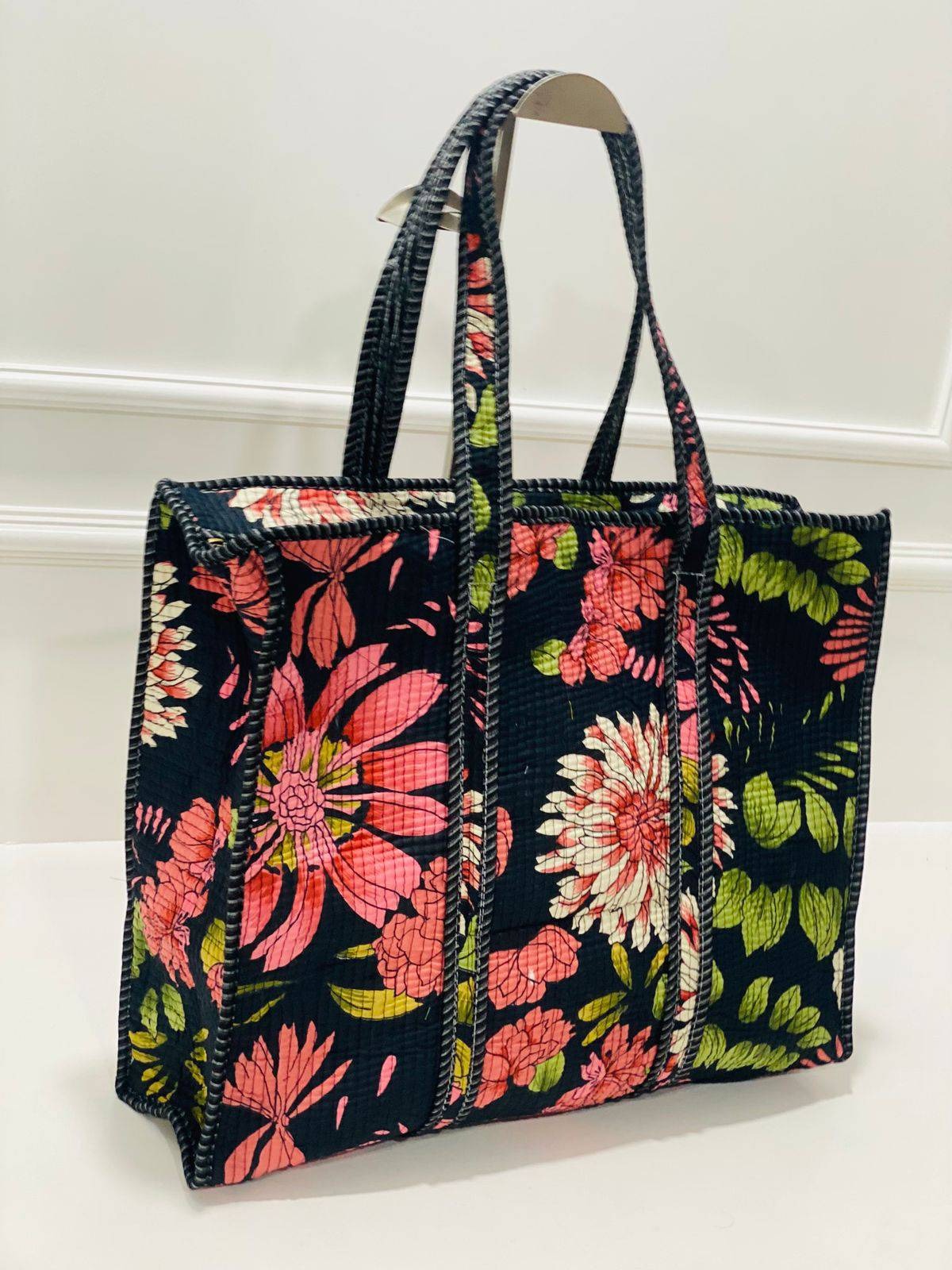 Transport yourself to a floral paradise with our Blush Pink Floral Garden Quilted Cotton Tote Bag. Inspired by traditional Indian block printing techniques, this tote bag showcases a vibrant floral pattern in shades of pink, coral, white, and green. The quilted fabric not only adds a luxurious texture but also provides durability and protection for your belongings.