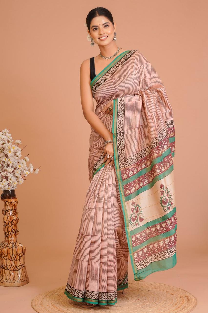 Featuring a broad floral border that adds a touch of sophistication, the careful placement of motifs and stripes showcases the skill involved in its creation. With 100% organic colors used in printing, this saree not only looks good but also reflects a commitment to sustainability.