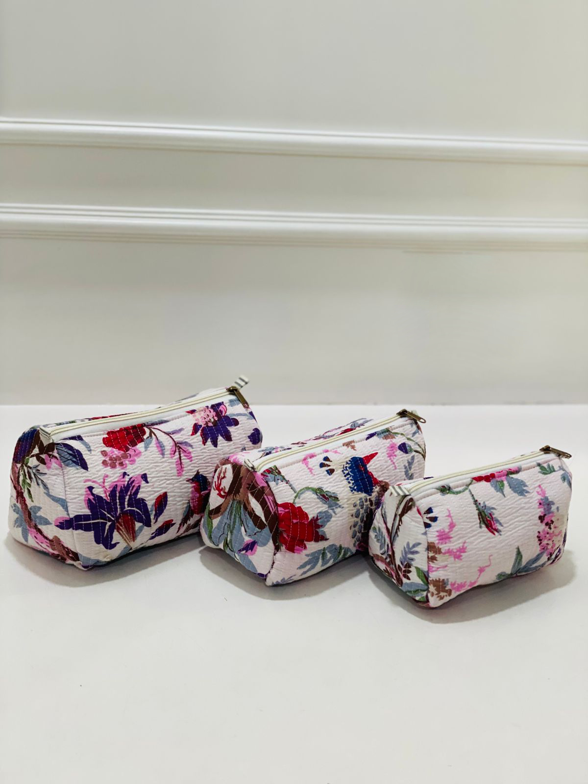 Delve into a world of vibrant colors and intricate designs with our Blushing Crimson Floral Quilted Toiletries Pouch Set. These artisan-crafted bags are a testament to the beauty of traditional Indian craftsmanship, featuring a stunning all-over floral motif that brings a touch of nature into your everyday essentials.