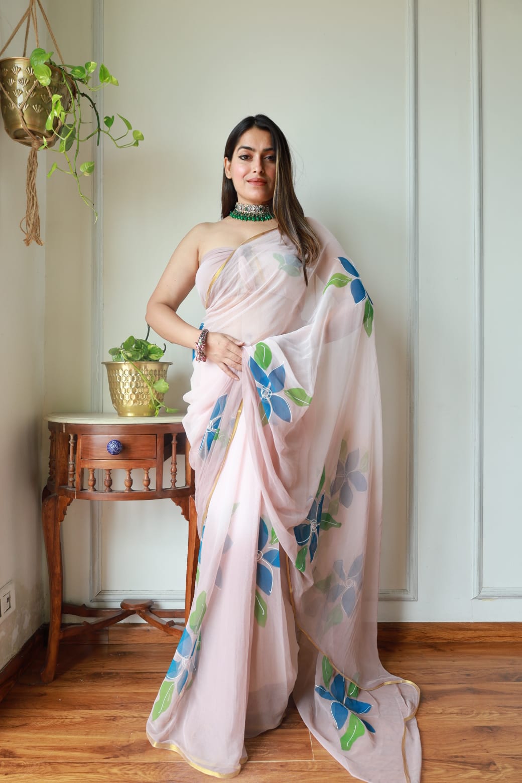 Are you searching for that one piece to bring a breath of fresh air into your wardrobe? Our Blushing Flora Hand-Painted Chiffon Saree offers an exquisite solution with its enchanting floral motifs that dance gracefully across a soft blush pink canvas. Each drape tells a story, inviting you to experience the delicate artistry that defines this garment.
