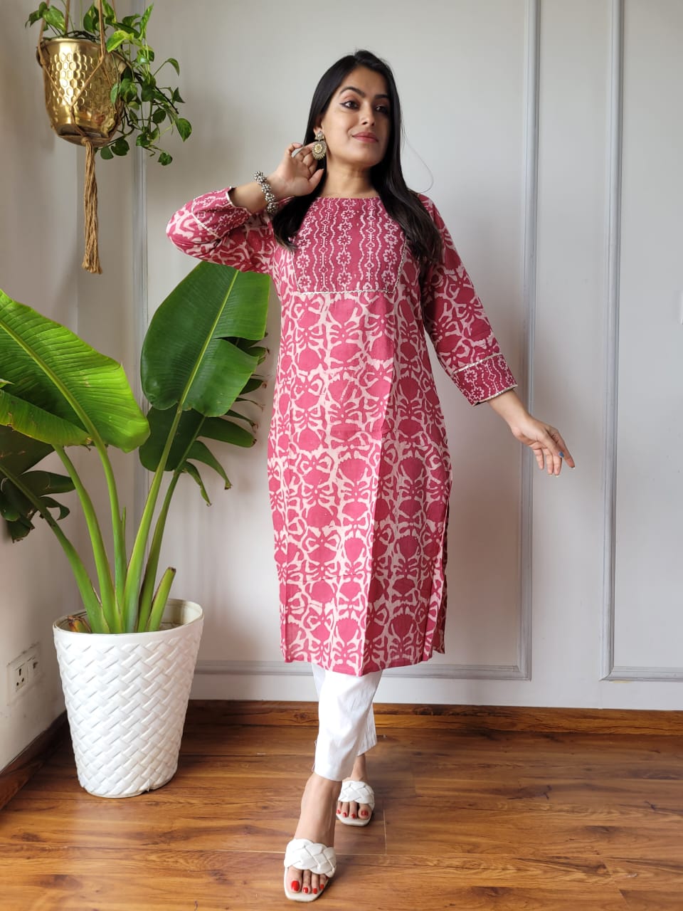 Indulge in the serene beauty of the Blushing Pink Floral Bliss Cotton Kurti Set, where intricate floral patterns dance gracefully on a soft pink canvas, accentuated by off-white accents. The artisanal techniques shine through in the delicate hand block printing, offering a unique touch to your wardrobe. The harmonious blend of pink and off-white creates a charming appeal, ideal for various occasions. Not only does this kurti set elevate your style, but it also ensures lasting comfort and breathability with its premium cotton fabric. Feel a deep connection to the rich Indian craft as you embrace the artistry woven into every stitch of this ensemble.