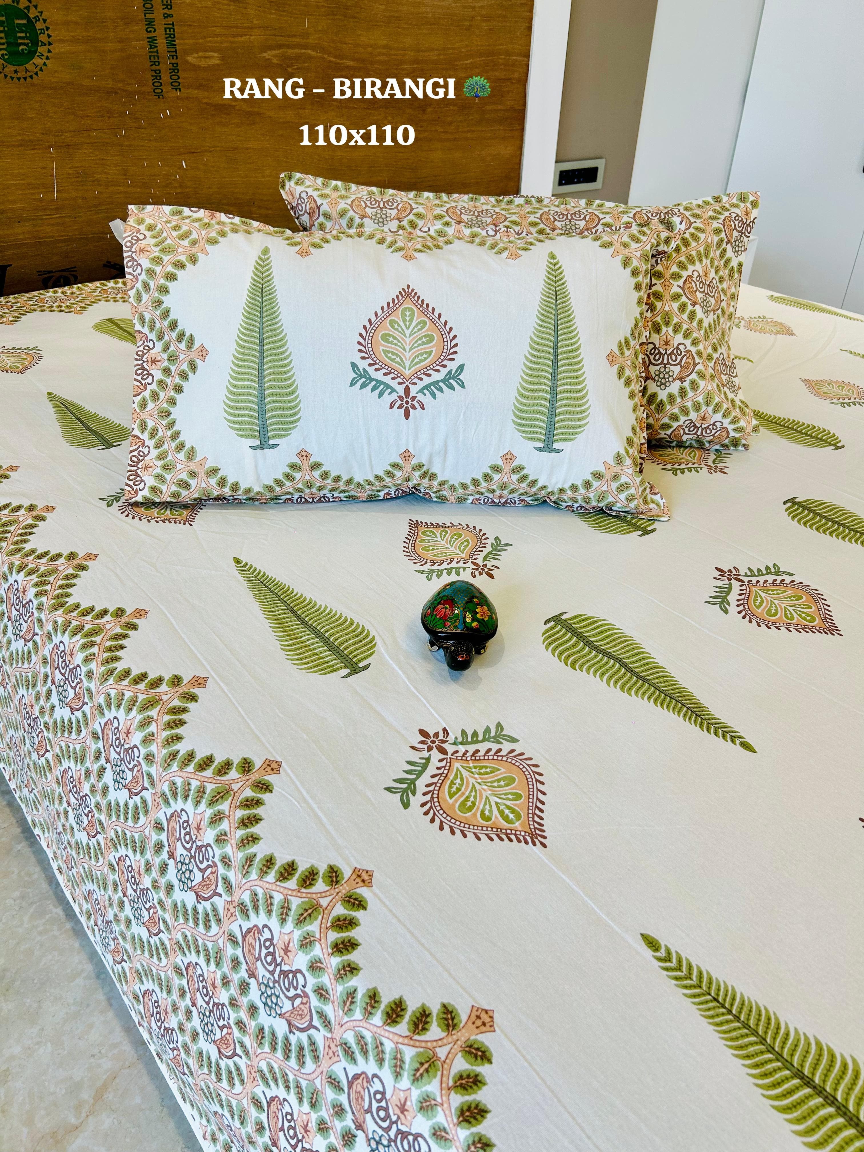 Indulge in the timeless beauty of hand block printing with our Botanical Green King Bedsheet Set. Crafted from premium cotton, this set features intricate botanical motifs in green, brown, and light orange. The detailed leafy border adds a touch of elegance. Experience the comfort and luxury of artisanal craftsmanship. Elevate your bedding ensemble with this nature-inspired set.
