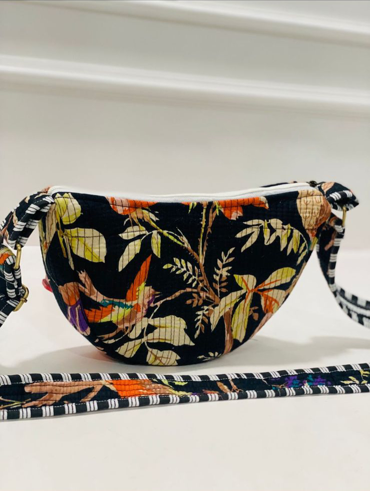 In a world where colors bloom with exuberance, our Botanical Harmony Quilted Sling Bag brings a touch of nature right into your daily ensemble. This striking accessory, adorned with a dance of vibrant florals against a deep black canvas, is more than just a bag; it’s a canvas of traditional artistry meeting contemporary fashion.