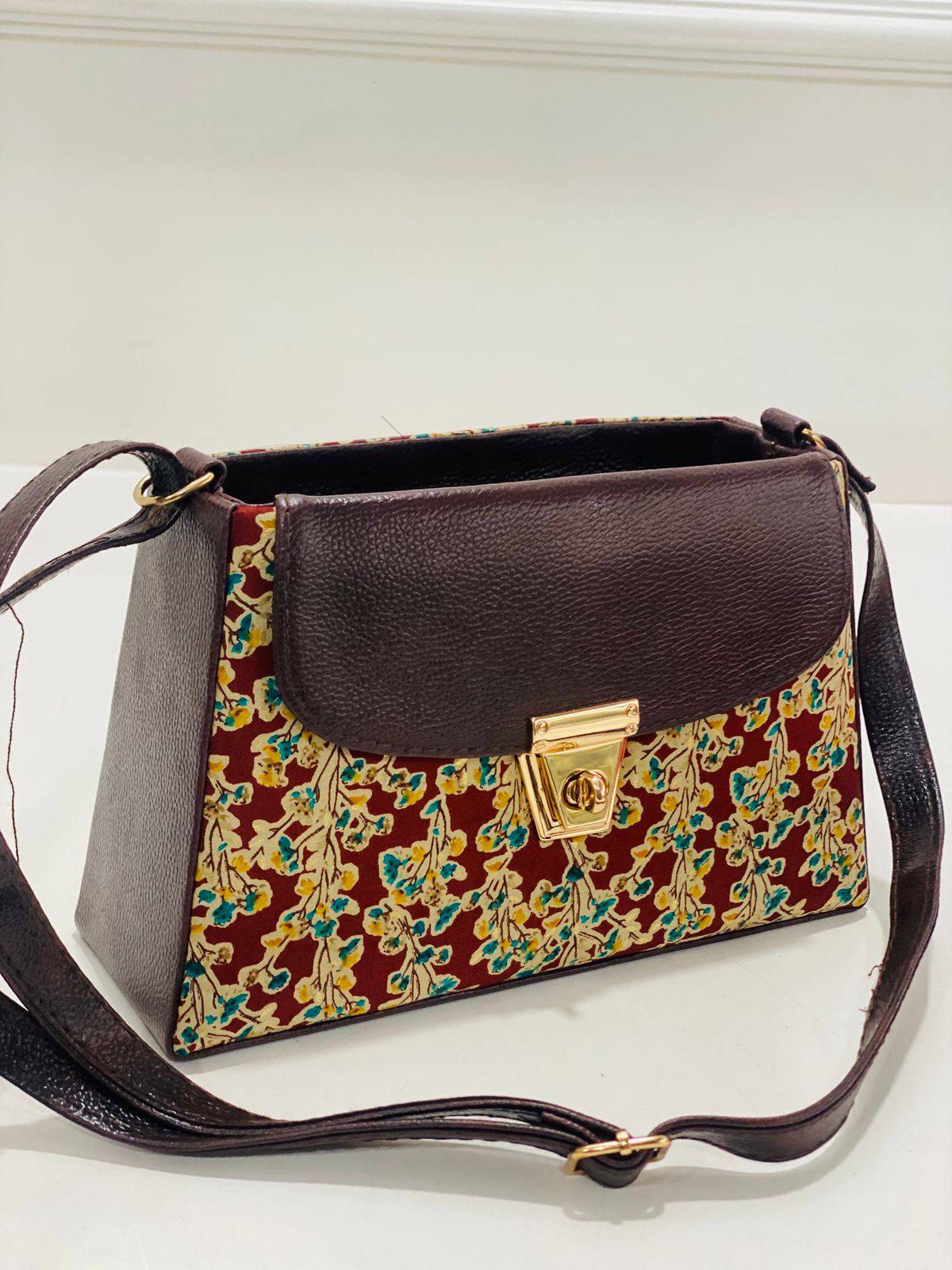 Step into a realm where rich heritage and modern sophistication intertwine. This exquisite hard box sling bag features a deep burgundy backdrop adorned with delicate floral motifs in soft yellow and teal. Each design element tells a story, carefully printed using traditional techniques that honor India's vibrant textile legacy.
