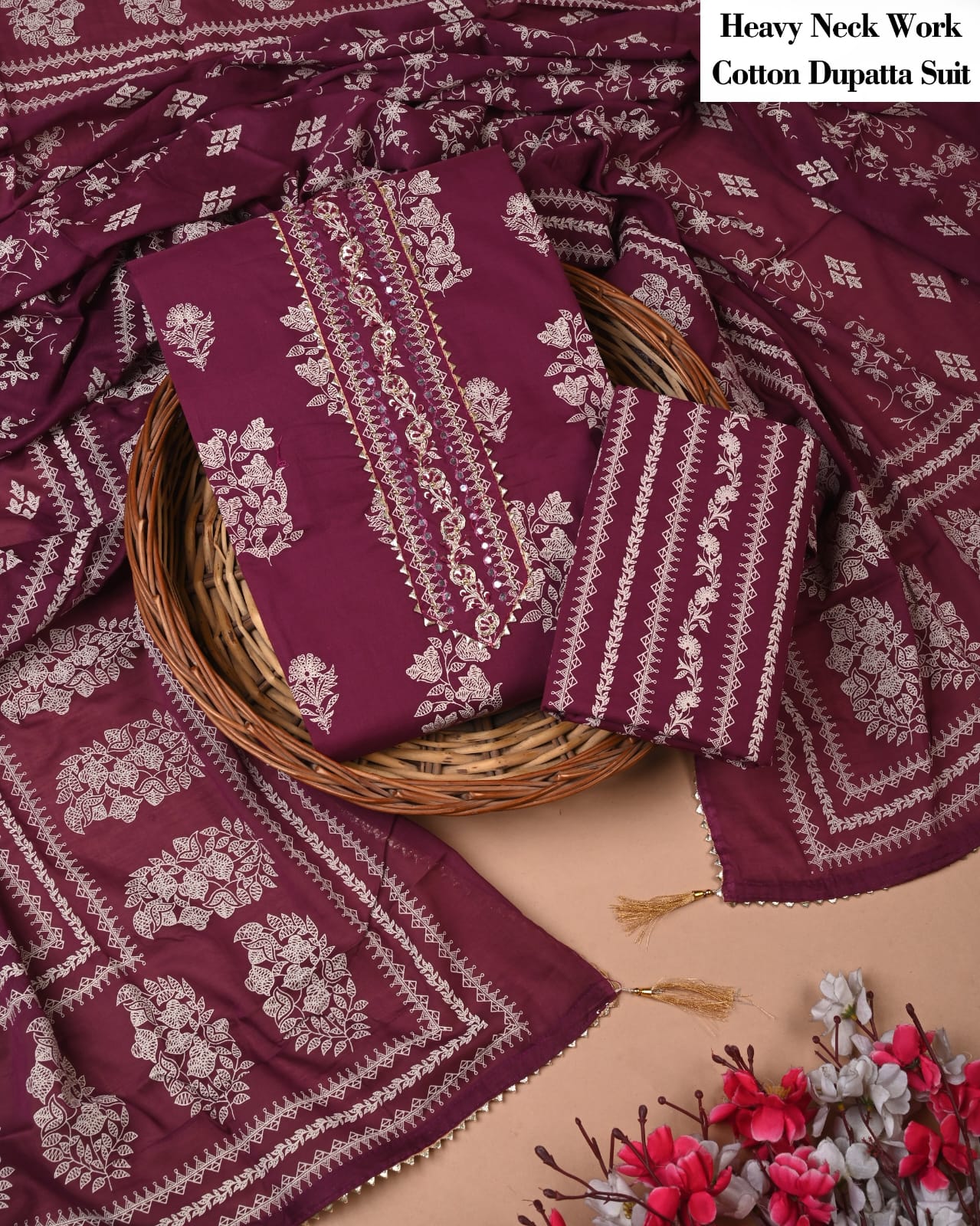 The finished dupatta, adorned with a rich zari border and stylish tassels, adds a sophisticated touch that enhances the overall aesthetic. Whether you’re dressing up for a festive occasion or seeking a statement piece for a casual outing, this suit set will become a cherished addition to your collection.