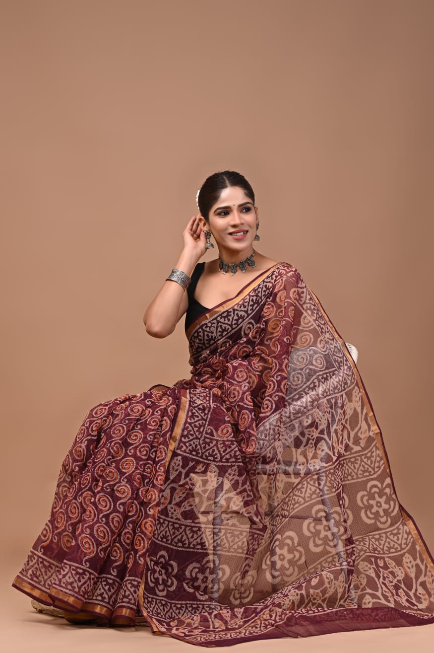 Crafted with a rich burgundy base, this Kota Doria saree is a mesmerizing blend of tradition and contemporary flair. Its intricate floral and paisley motifs in soft cream and muted gold dance gracefully across the fabric, bringing a touch of elegance to every occasion.