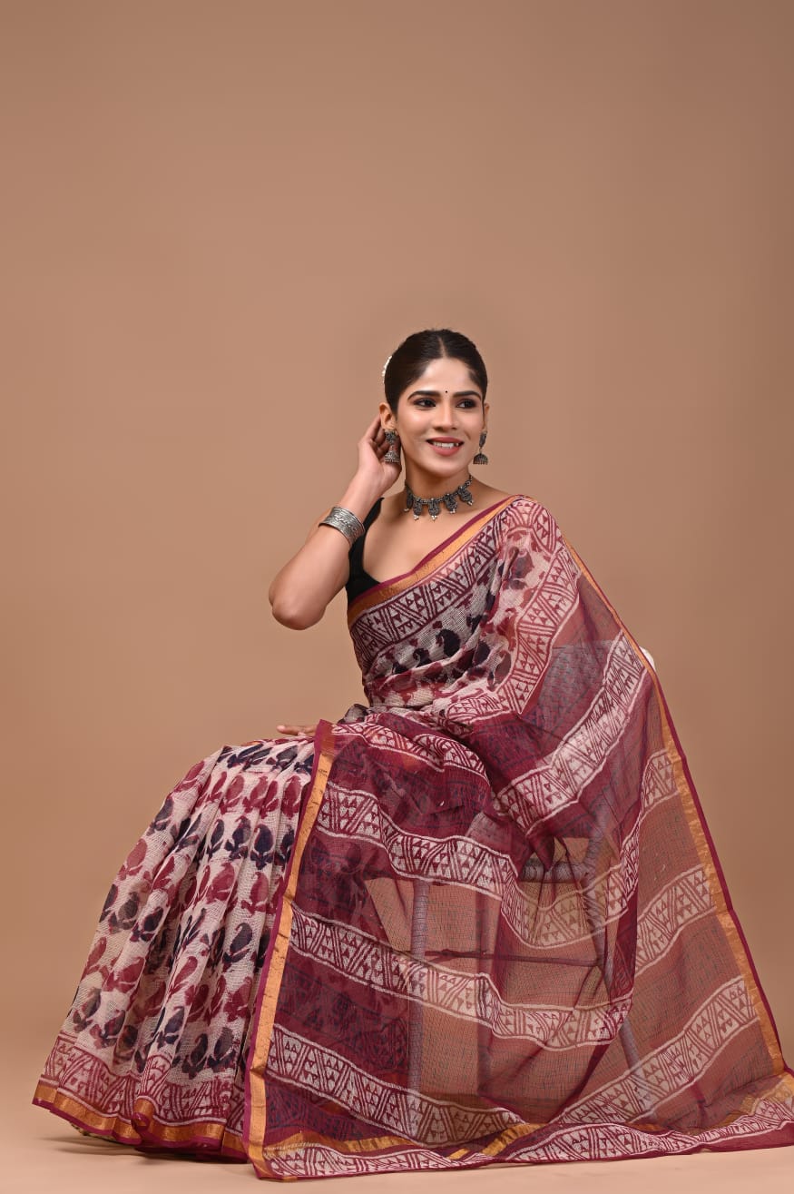 Embrace the beauty of tradition with this exquisite Kota Doria saree, where rich burgundy is adorned with intricate floral and geometric patterns. Each motif tells a story, showcasing the artistry of skilled artisans whose hands bring the fabric to life. The combination of soft cotton and a delicate silk border not only enhances its visual appeal but also ensures comfort, making it an ideal companion for warm days.