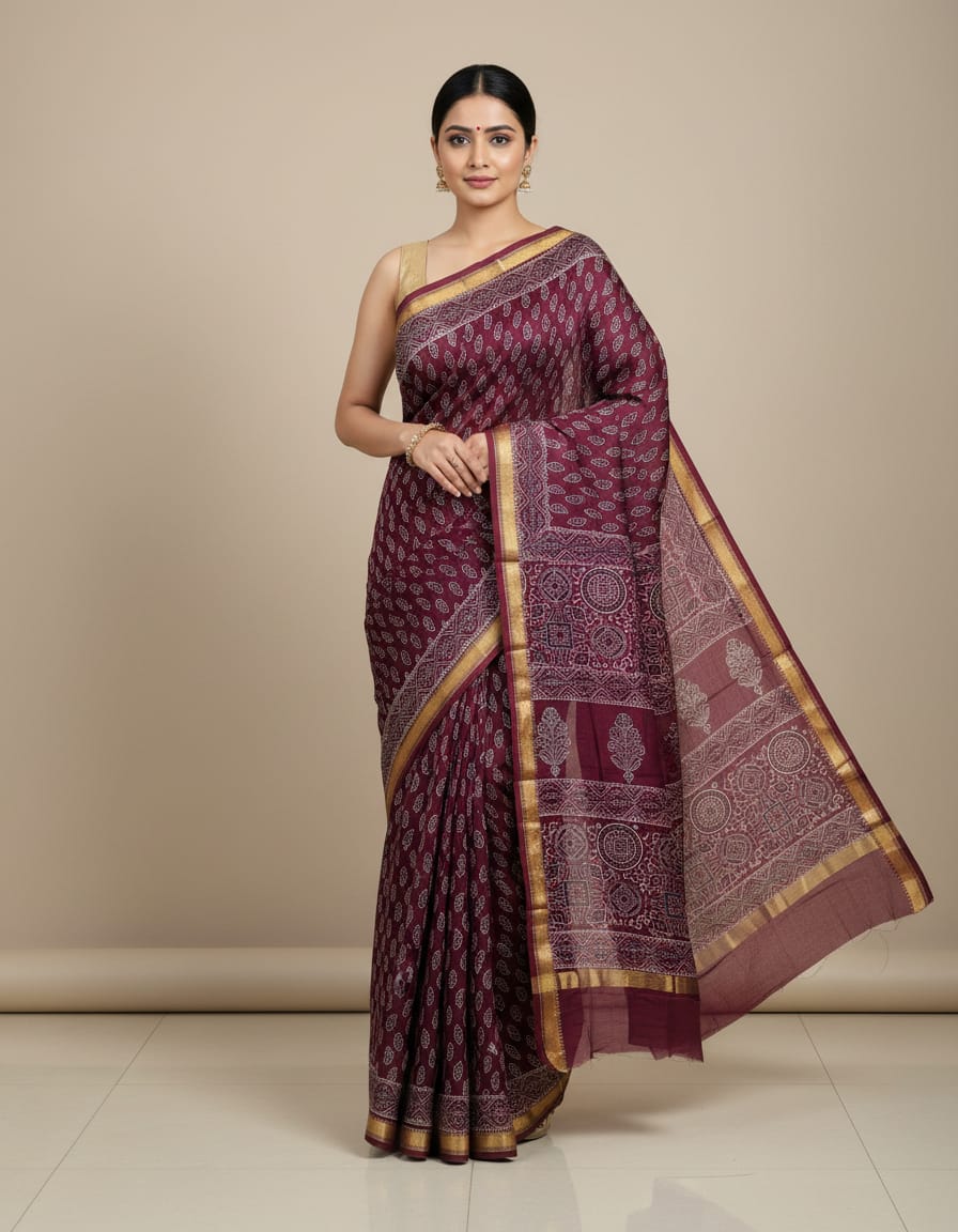 In a landscape filled with fleeting trends, this burgundy saree stands as a testament to artisanal craftsmanship. The fabric, woven from pure Maheshwari silk, exudes a soft luster that catches the light beautifully. Its intricate designs, a delightful fusion of geometric shapes and floral motifs, reflect the rich heritage of Indian textiles while inviting a contemporary flair. The contrasting off-white patterns create a striking visual that is both captivating and sophisticated.