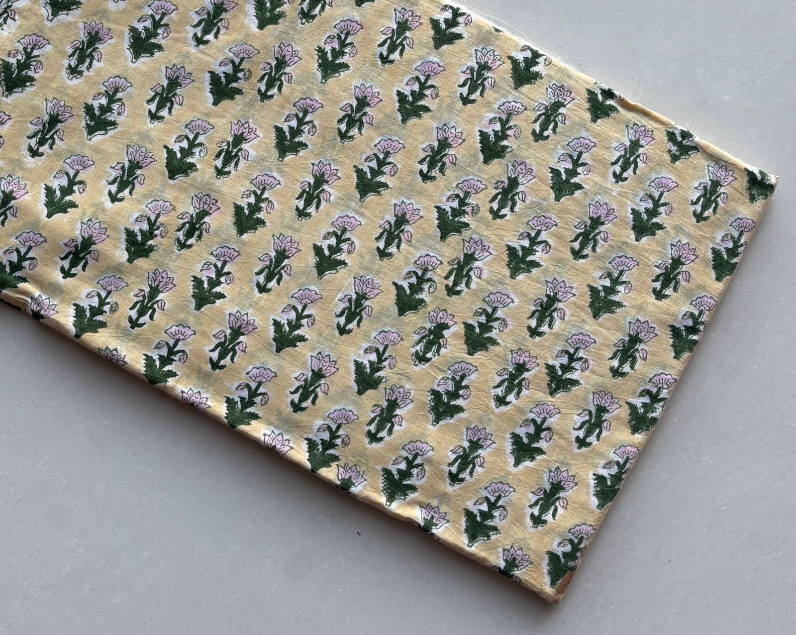 Let your creativity flourish with our Butter Yellow Floral Artisan-Printed Cotton Fabric, a delightful blend of tradition and contemporary flair. The warm butter yellow base is playfully adorned with soft pink blossoms and lush forest green leaves, echoing the charm of a sunlit garden.