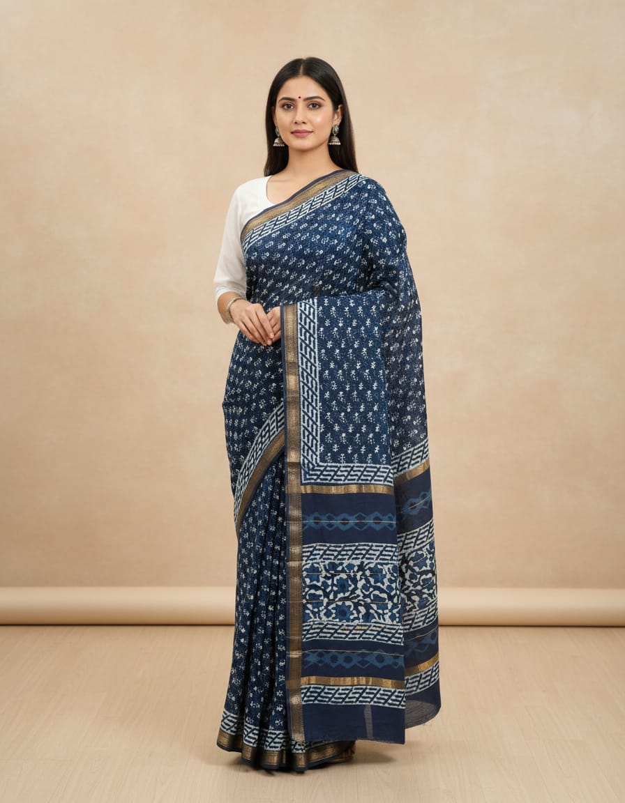 Feeling the weight of daily life? Refresh your wardrobe with our Cerulean Blooms Bagru Hand Block Print Saree, a stunning piece that marries tradition with contemporary flair. Crafted from pure Maheshwari silk, its lightweight and lustrous fabric glides effortlessly against your skin, making it a joy to wear. The intricate designs, printed using 100% organic colors, showcase the artisanal mastery of Bagru block printing, where each motif speaks of rich cultural heritage.