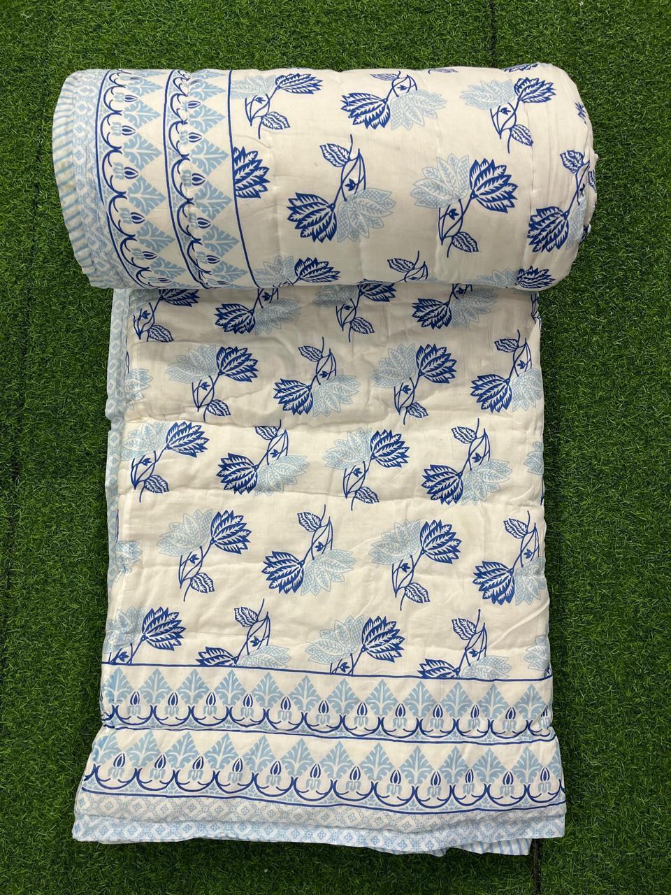 Delve into a world where rich traditions meet modern aesthetics with our Cerulean Blossom Print Cotton Quilt. This exquisite piece is thoughtfully crafted to embody the vibrant spirit of Indian artistry, bringing a unique charm to your living space.