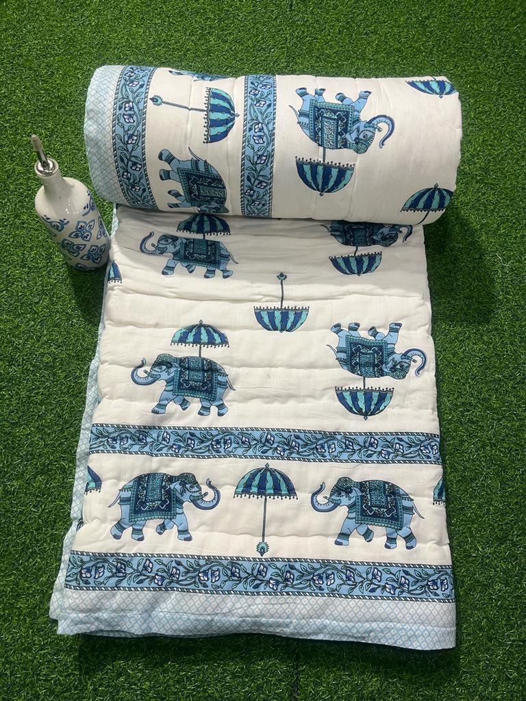 Rooted in the rich tapestry of Indian textile traditions, our quilt features an enchanting dance of geometric elephants and whimsical umbrellas, masterfully printed by hand. This artisan-crafted piece embodies the exquisite detail and artistry that Blockart is known for, making it not just a bedding item, but a vibrant statement of culture and creativity.