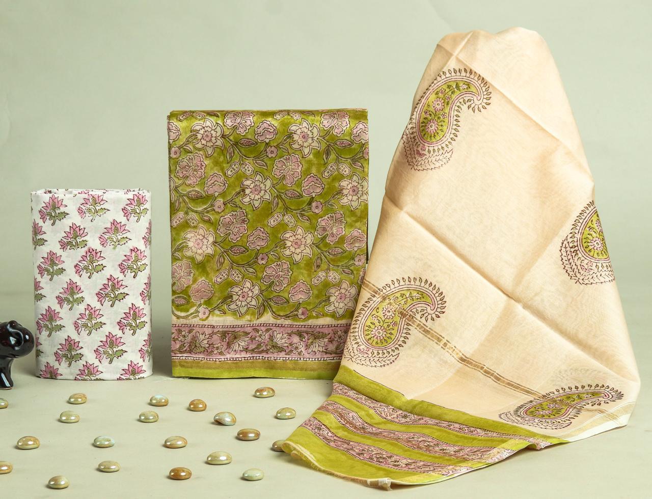 Elevate your ethnic wardrobe with this exquisite hand block printed Chanderi Silk Dress Material Set from Blockart. Crafted with precision, each piece showcases intricate floral and paisley motifs in soft pink, green, and beige tones, echoing traditional Indian craftsmanship. The top and dupatta, both in Chanderi Silk, exude elegance and grace, while the comfortable cotton bottom ensures a perfect fit. Embrace the artistry and comfort of authentic Indian textiles. Explore our Chanderi Sarees collection.