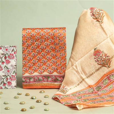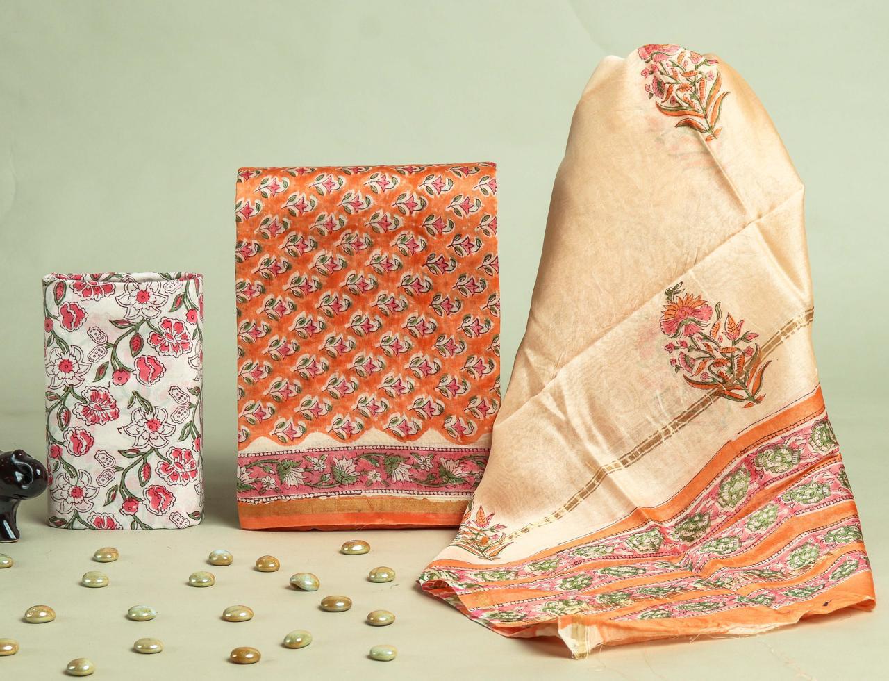 Indulge in the exquisite art of hand block printing with these premium Chanderi Silk Dress Materials from Blockart. Crafted with intricate floral motifs in shades of pink, orange, and green, these fabrics exude traditional charm and elegance.