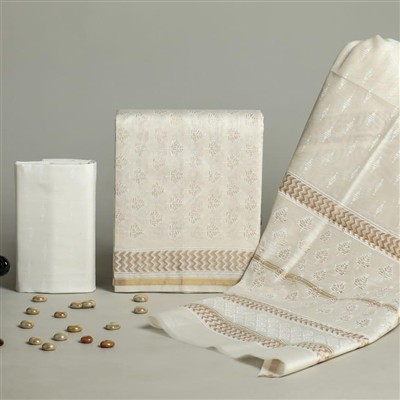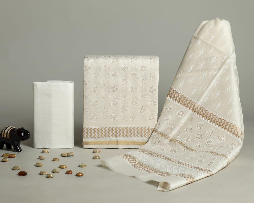 Indulge in the exquisite art of hand block printing with this premium Chanderi silk dress material set from Blockart. Crafted with intricate leaf motifs and a delicate beige and white zigzag border, this set exudes elegance and traditional charm. The chanderi silk fabric offers a smooth texture and subtle sheen, making it a luxurious choice for ethnic wear.