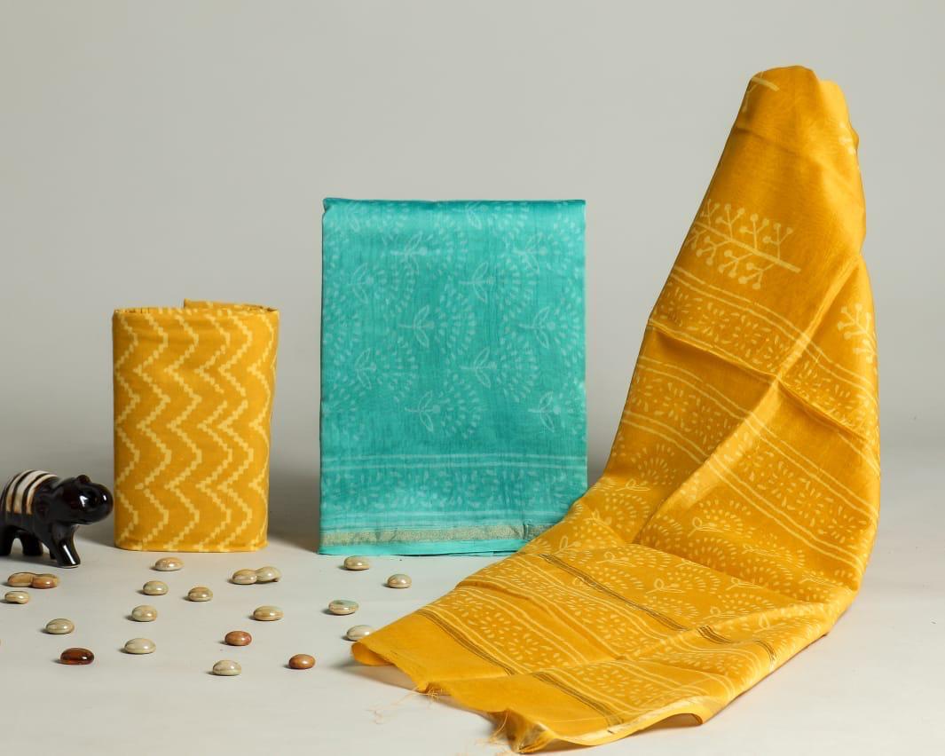 Elevate your wardrobe with this exquisite Chanderi Silk Mustard Floral Dress Material Set from Blockart. Handcrafted with precision, this set features intricate floral and geometric patterns that showcase traditional Indian craftsmanship. The top and duptta are made of luxurious Chanderi silk, providing a soft and elegant drape, while the bottom crafted from cotton offers comfort and breathability. Perfect for creating your own ethnic ensembles, this set embodies the essence of premium hand block printing.