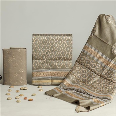 Elevate your wardrobe with this exquisite hand block printed Chanderi silk dress material set from Blockart. Crafted with precision and care, this ensemble features intricate geometric motifs in olive green, beige, and white hues. The top and duptta are made of luxurious Chanderi silk, while the bottom is crafted from soft cotton for comfort. Embrace the artistry of traditional Indian craftsmanship with this premium set.