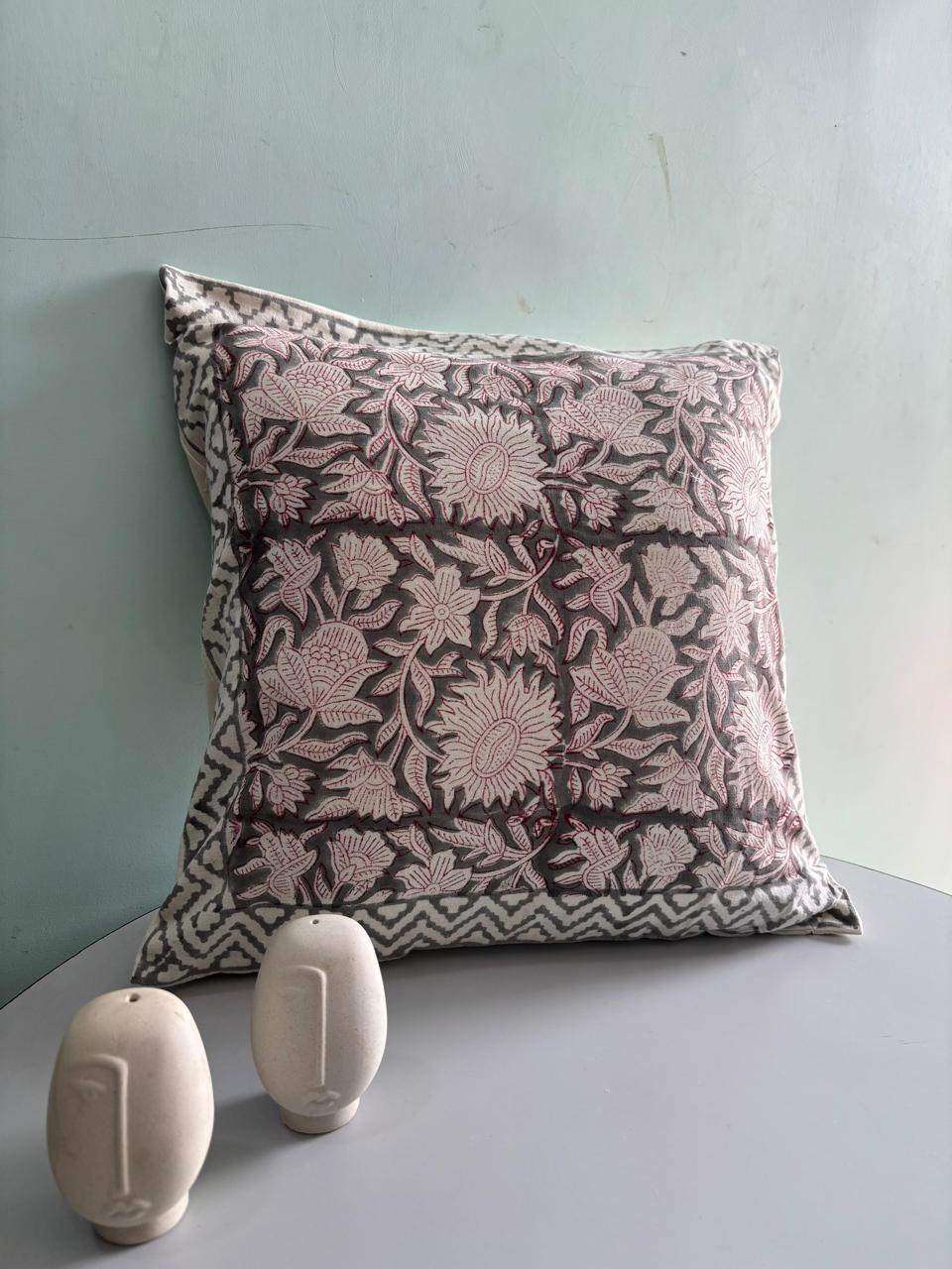 Delve into the rich heritage of Indian craftsmanship with our Charcoal Blossom cushion covers, where every piece tells a story. The intricate floral motifs, blooming in soft blush pink against a deep charcoal backdrop, create a harmonious balance that captures the essence of artisanal artistry.