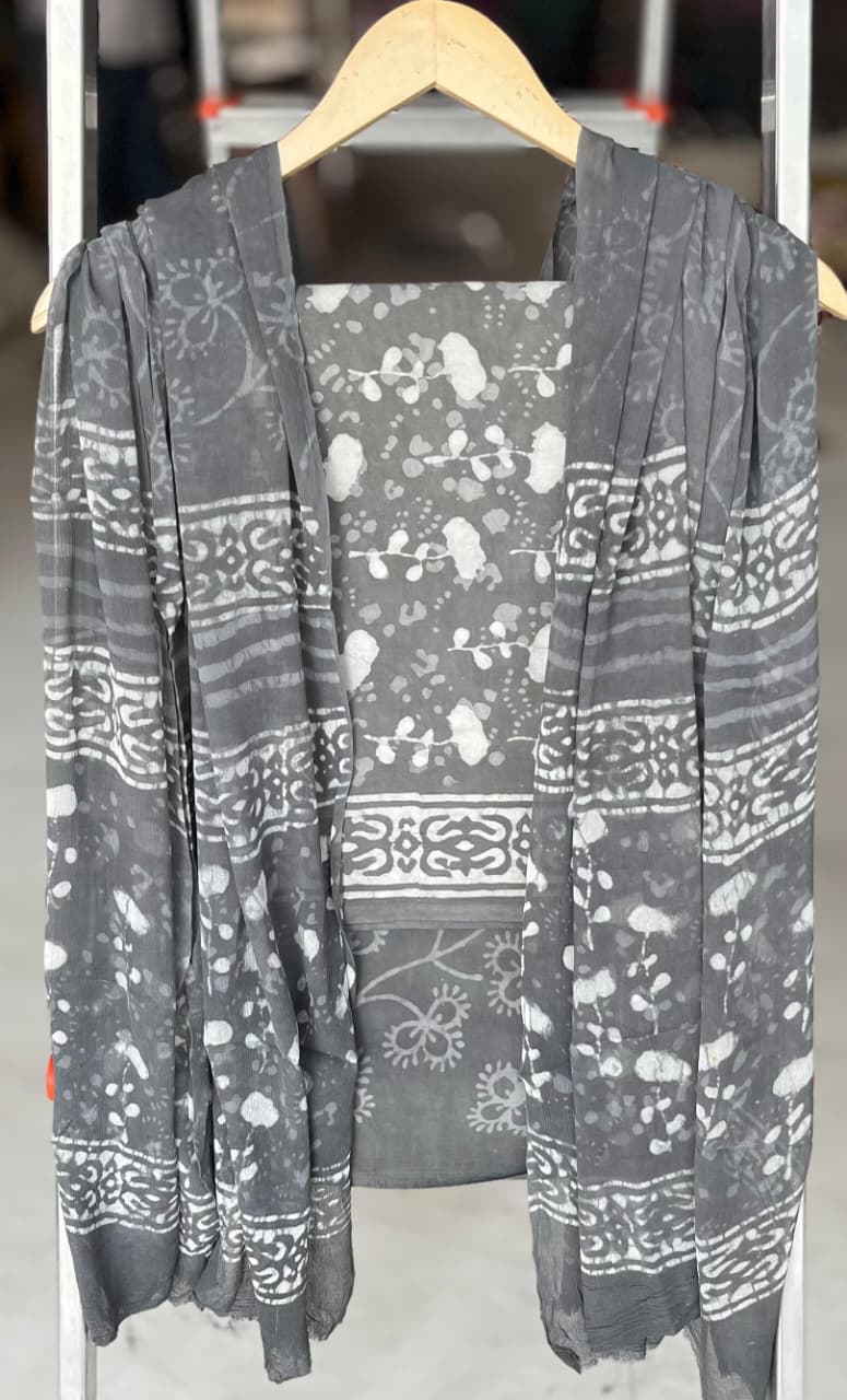 Looking to add a touch of artisanal charm to your wardrobe? This exquisite cotton dress material invites you to explore the perfect blend of tradition and contemporary flair. Designed with intricate geometric patterns in a soft charcoal gray, it offers a breathable and lightweight fabric that drapes effortlessly against your skin.