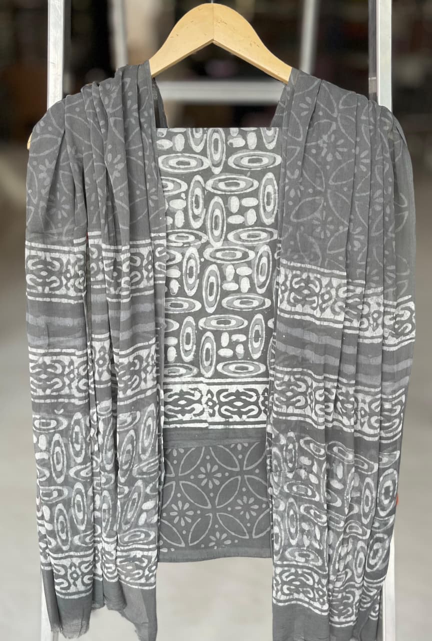 Step into a tapestry of artistry with our Charcoal Elegance Geometric Cotton Suit Set, a stunning representation of traditional hand block printing. Crafted from 100% pure cotton, this unstitched three-piece dress material is designed for those who appreciate the beauty of authentic Indian craftsmanship.