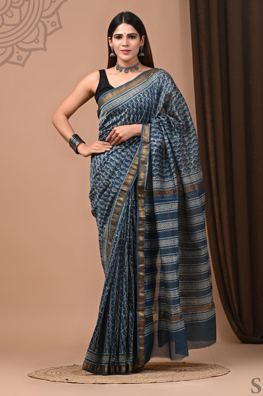 A stylish teal blue saree with an intricate, all-over white block print of interlocking shapes. The pallu is a beautiful composition of horizontal stripes and patterns in shades of white, teal, and a light grey. A shimmering gold border with a thin black line provides a touch of sophistication, making this a perfect saree for a modern, ethnic ensemble.
