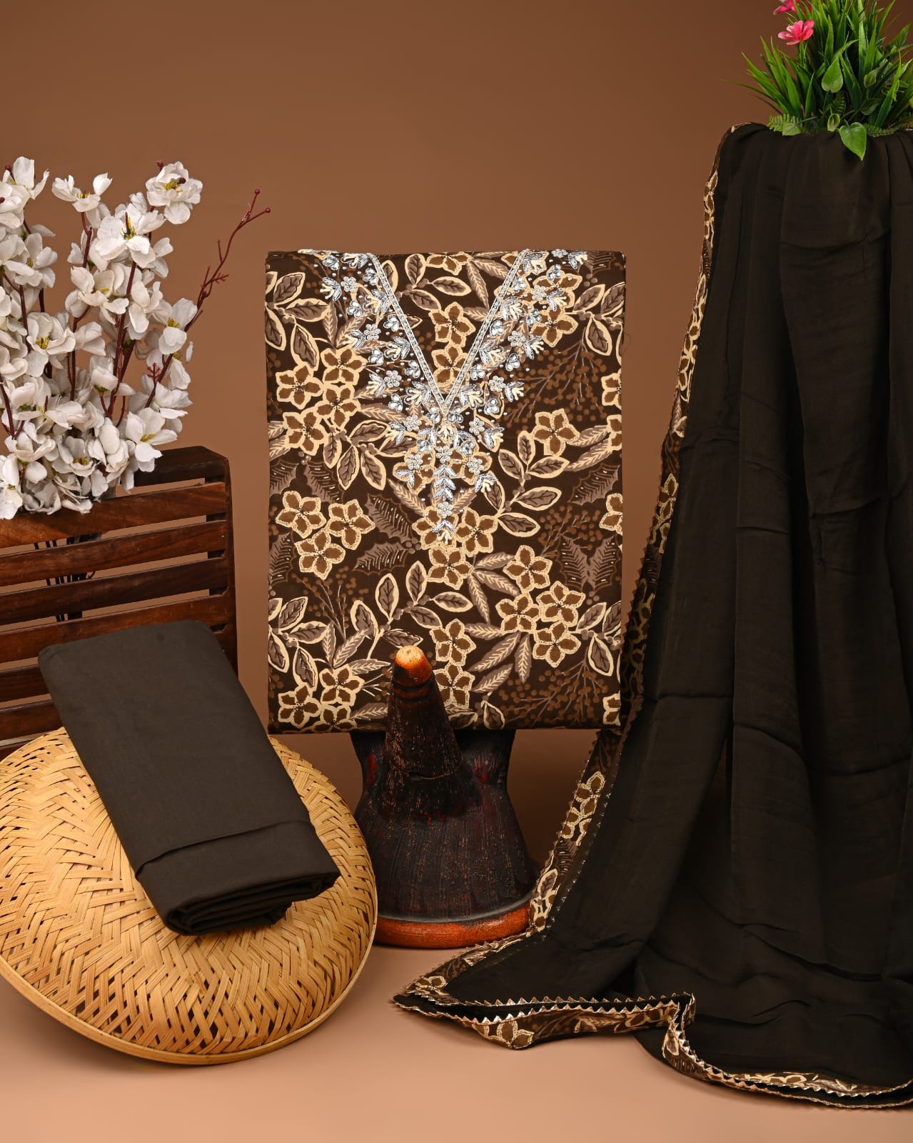Indulge in the timeless elegance of our Chocolate Blossom Jaipuri Cotton Suit Set, where each thread is a testament to the skills passed down through generations. The rich chocolate base is adorned with delicate floral embroideries, invoking the charm of nature's beauty.