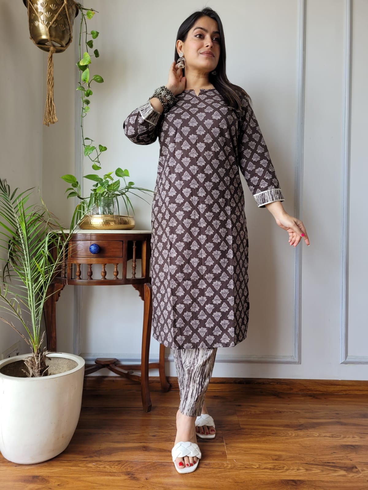 Rooted in the rich heritage of Indian textiles, our Chocolate Leaf Motif ensemble epitomizes the delicate balance between tradition and modernity. Crafted from soft, breathable cotton, this outfit showcases intricate Bagru block prints, where each geometric motif narrates a story of craftsmanship passed down through generations.
