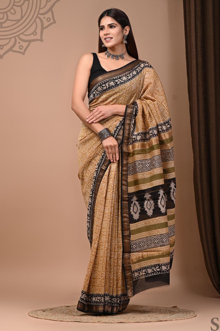 This timeless saree showcases a beautiful contrast between its light beige body and a bold, multi-patterned black pallu. The body features a subtle, all-over geometric print, while the pallu is a striking mix of stripes, floral, and traditional block print motifs. The black and gold borders frame the design elegantly, creating a rich and classic aesthetic suitable for festive occasions and celebrations.