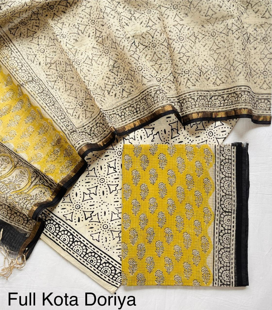 Embrace timeless style this summer with this classic print Kota Doria suit. Crafted from Kota Doria fabric, it is celebrated for its lightweight, airy, and breathable qualities, with its distinctive square-check weave ensuring comfort in warm weather. The "classic print" refers to enduring and beloved patterns that transcend trends. These often include traditional Indian motifs like paisleys, delicate florals, simple geometric patterns, or subtle abstract designs, typically in harmonious or soothing color palettes. This suit is a versatile and reliable choice for daily wear, casual outings, or any summer occasion where you desire an elegant and comfortable look.