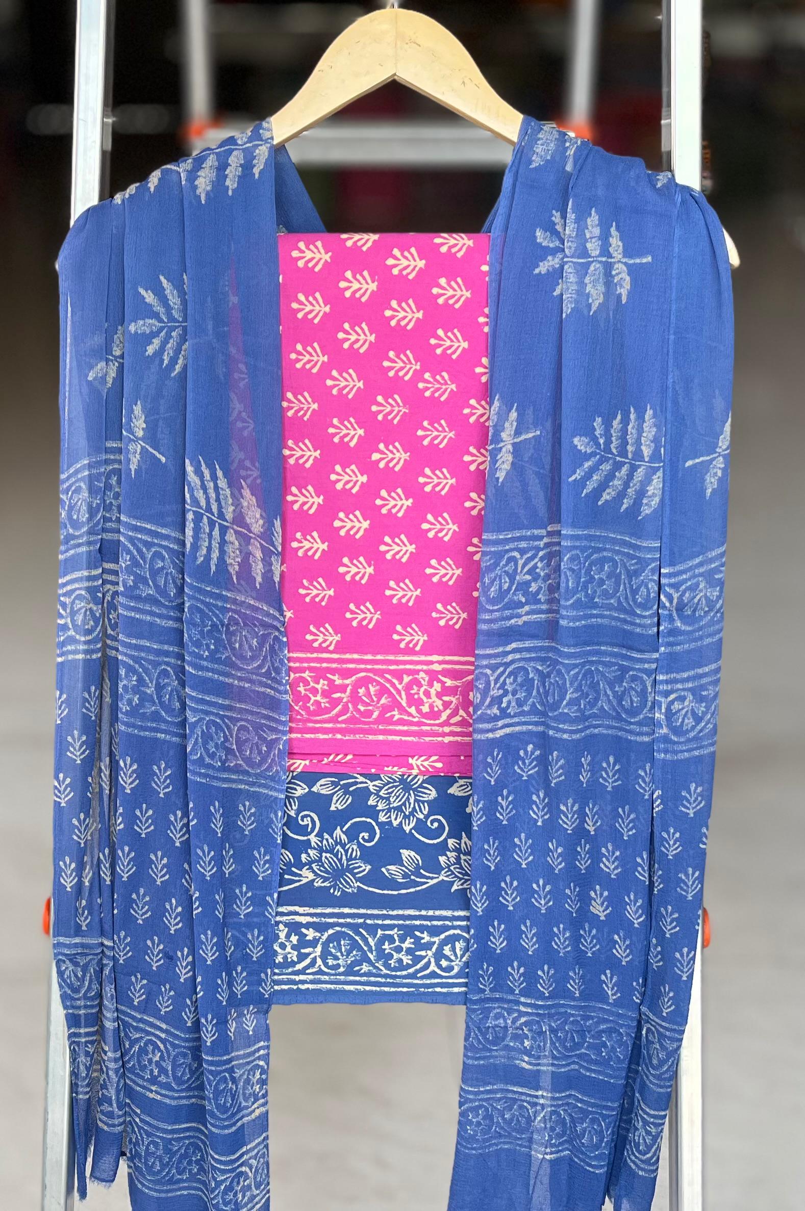 Discover the essence of artisanal textile craftsmanship with our Cobalt Elegance Floral Cotton Suit Set. This exquisite ensemble harmonizes the vibrant cobalt blue backdrop with enchanting botanical motifs, intricately hand-printed to capture the spirit of Indian tradition.