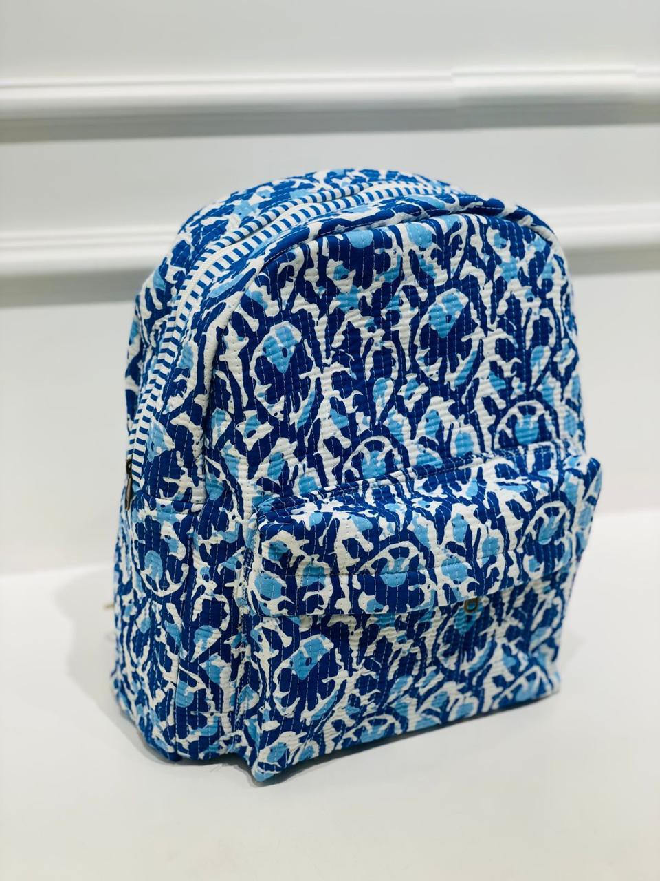 In a world where everyday bags often lack personality, our Cobalt Floral Embrace Quilted Backpack offers a refreshing escape. The deep cobalt blue background is a canvas for delicate floral motifs in lighter tones, creating a dance of color that draws the eye. Each piece is artisan-crafted, showcasing the rich traditions of Indian block printing.
