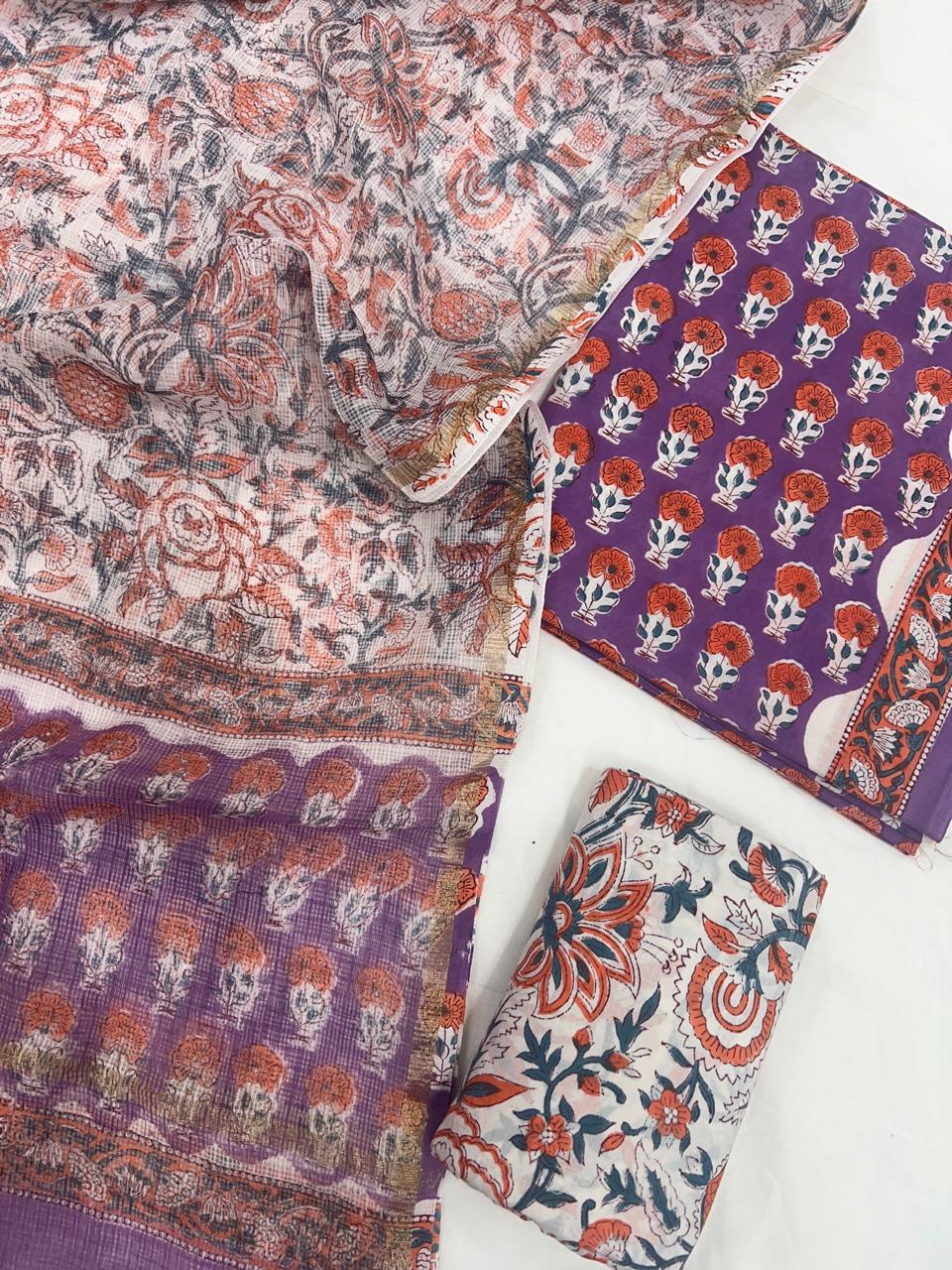 Rooted in the rich tapestry of Indian textile traditions, the Coral Blossom Floral Cotton Dress Material is a celebration of intricate craftsmanship. This hand block printed fabric showcases a stunning array of coral flowers set against a delicate cream backdrop, creating a timeless elegance that enchants the eye.
