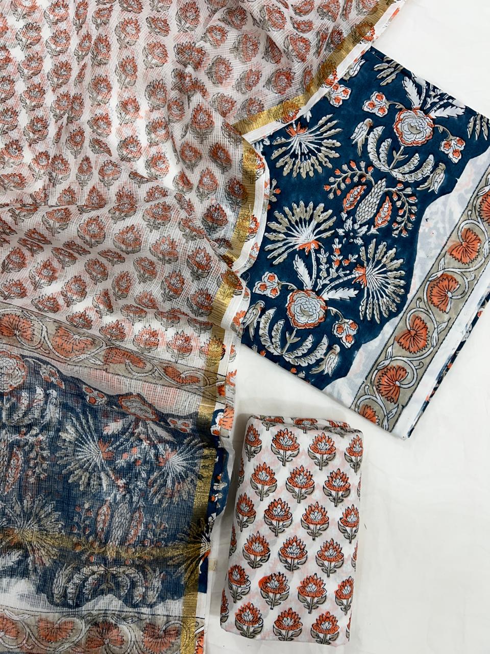Immerse yourself in the beauty of Indian textile traditions with this stunning fabric ensemble. The deep navy backdrop serves as an elegant canvas for the delicate coral and peach floral motifs, inviting you to create a piece that embodies both grace and creativity. With its lightweight texture and semi-sheer quality, this fabric drapes effortlessly, lending a sense of fluidity to your designs.