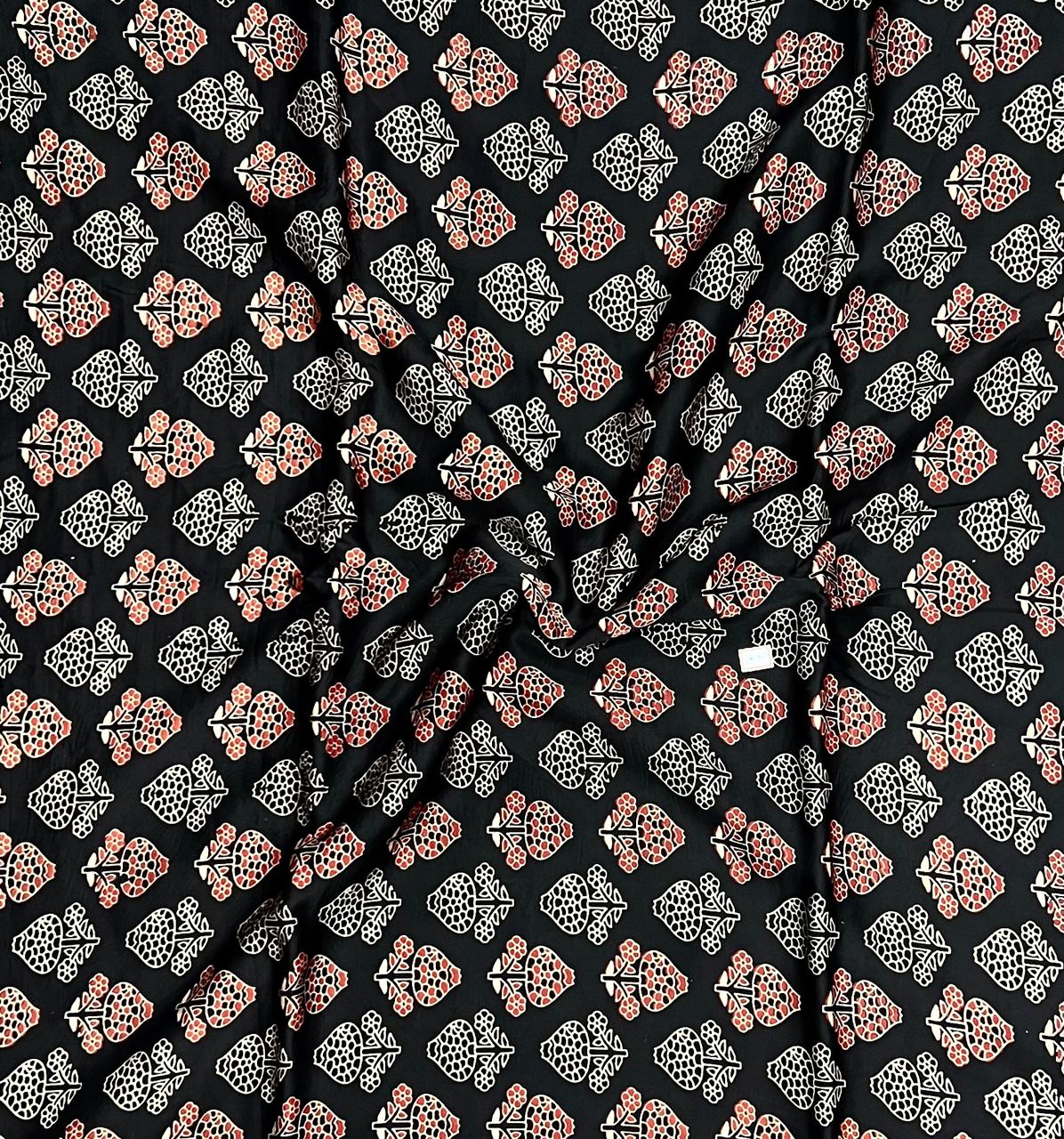 Offering a rich contrast of deep black and warm coral tones, this fabric showcases a captivating array of intricate geometric floral motifs. Each design element is a testament to the incredible skill of Indian artisans, reflecting a blend of tradition and modernity.