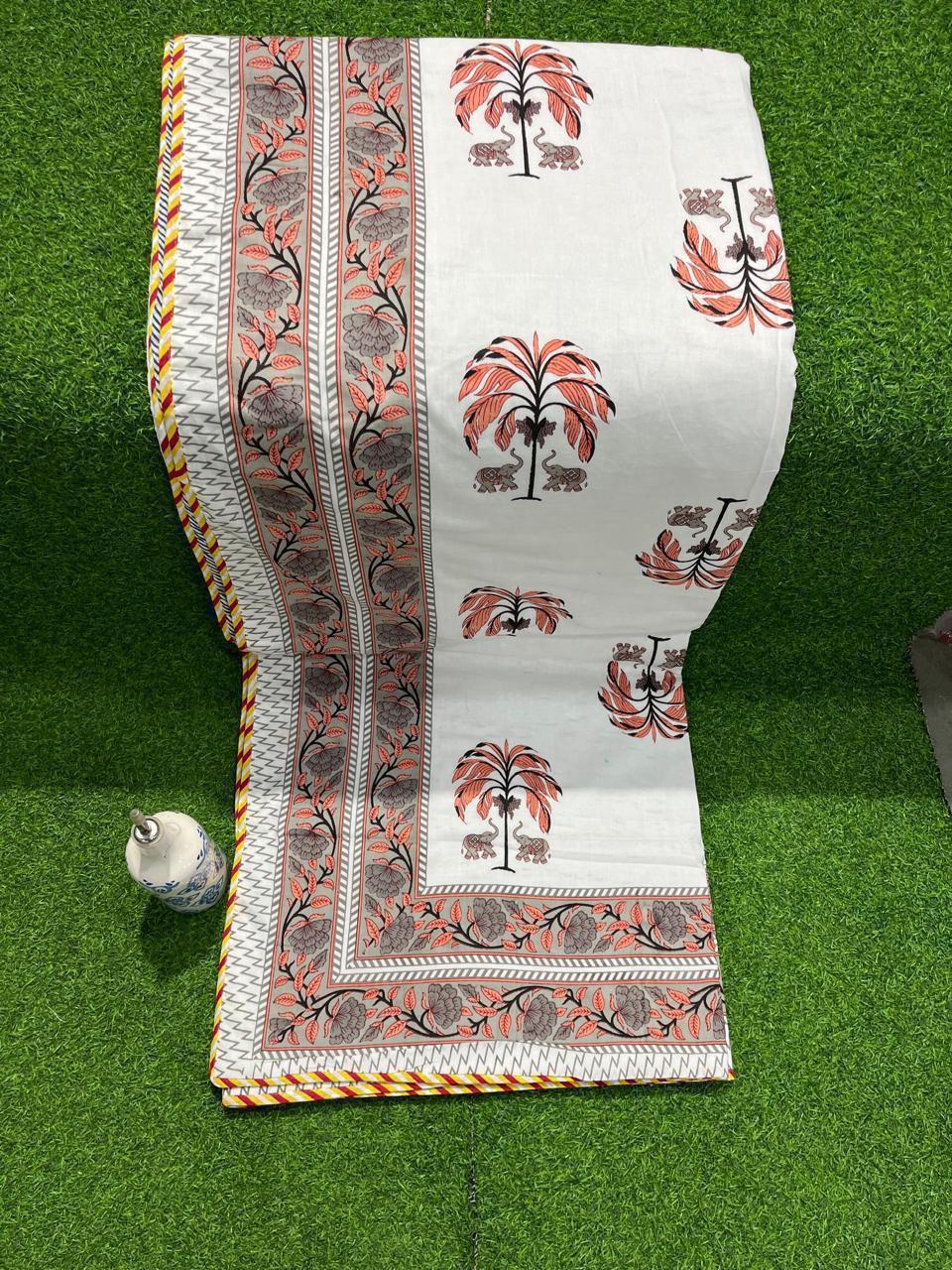 Rich in heritage and artistry, the Coral Elephant Palm Cotton Dohar embodies the vibrant spirit of Indian craftsmanship. Each piece showcases a stunning blend of stylized palm trees and majestic elephants, intricately block printed on a crisp white base. The thoughtful layering of colors—coral for the palm motifs and charcoal gray for the elephants—balances the lively patterns, while the borders echo geometric designs in mustard yellow and crimson, adding a playful contrast.