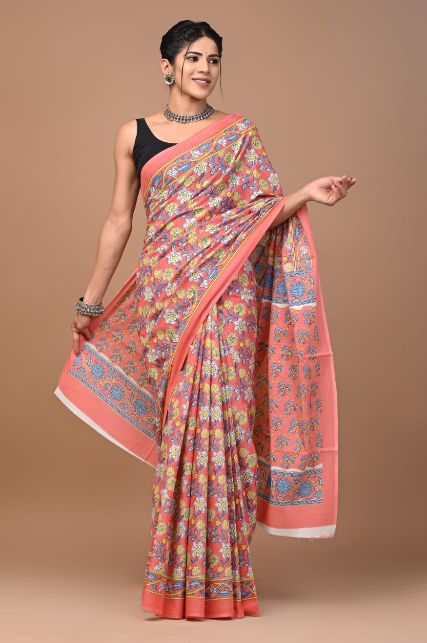 Indulge in the timeless art of hand block printing with our Coral Floral Mulmul Saree. Crafted from premium mulmul cotton fabric, this saree features a coral pink base adorned with intricate floral patterns in yellow, white, and blue. The detailed blue and white borders add an elegant touch, making it perfect for casual or semi-formal occasions. The pallu showcases a denser floral pattern, enhancing its ethnic appeal. Embrace traditional Indian craftsmanship with this exquisite saree.