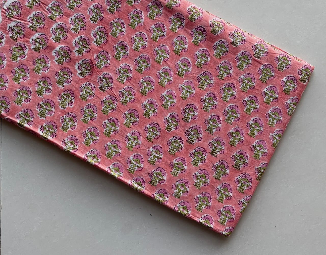 This delightful cotton fabric showcases a soft coral pink backdrop, adorned with whimsical clusters of lavender flowers and muted green leaves. Each floral motif reflects a playful charm, inviting creativity into your wardrobe. Artisan-crafted with attention to detail, the smooth and lightweight nature of this textile makes it a joy to wear.