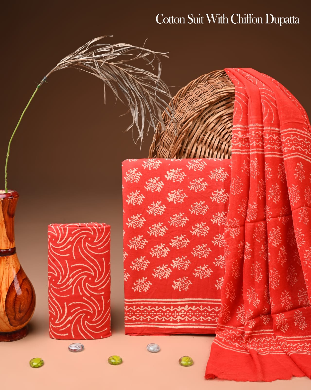 Step into a realm of vibrant artistry with our Coral Whirl Floral Chiffon Cotton Suit Set. This exquisite ensemble celebrates the rich heritage of Indian craftsmanship, featuring a stunning interplay of swirling wave-like designs and delicate floral motifs. Each piece is artisan-crafted, ensuring a unique touch that sets you apart.