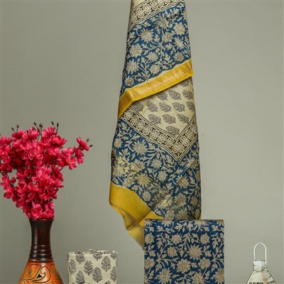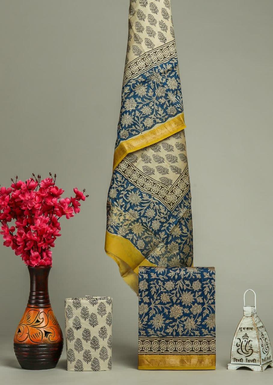 Indulge in the rich elegance of this Cream and Deep Blue Floral Silk Maheswari Suit Ensemble, a true marvel of artisanal craftsmanship. The silk fabric boasts intricate golden floral and leaf patterns on a deep blue background, complemented by a golden-yellow border for a touch of opulence. The cream section features delicate black leaf motifs, adding depth to the design. This ensemble exudes sophistication and cultural charm, ideal for special occasions where you want to make a statement.