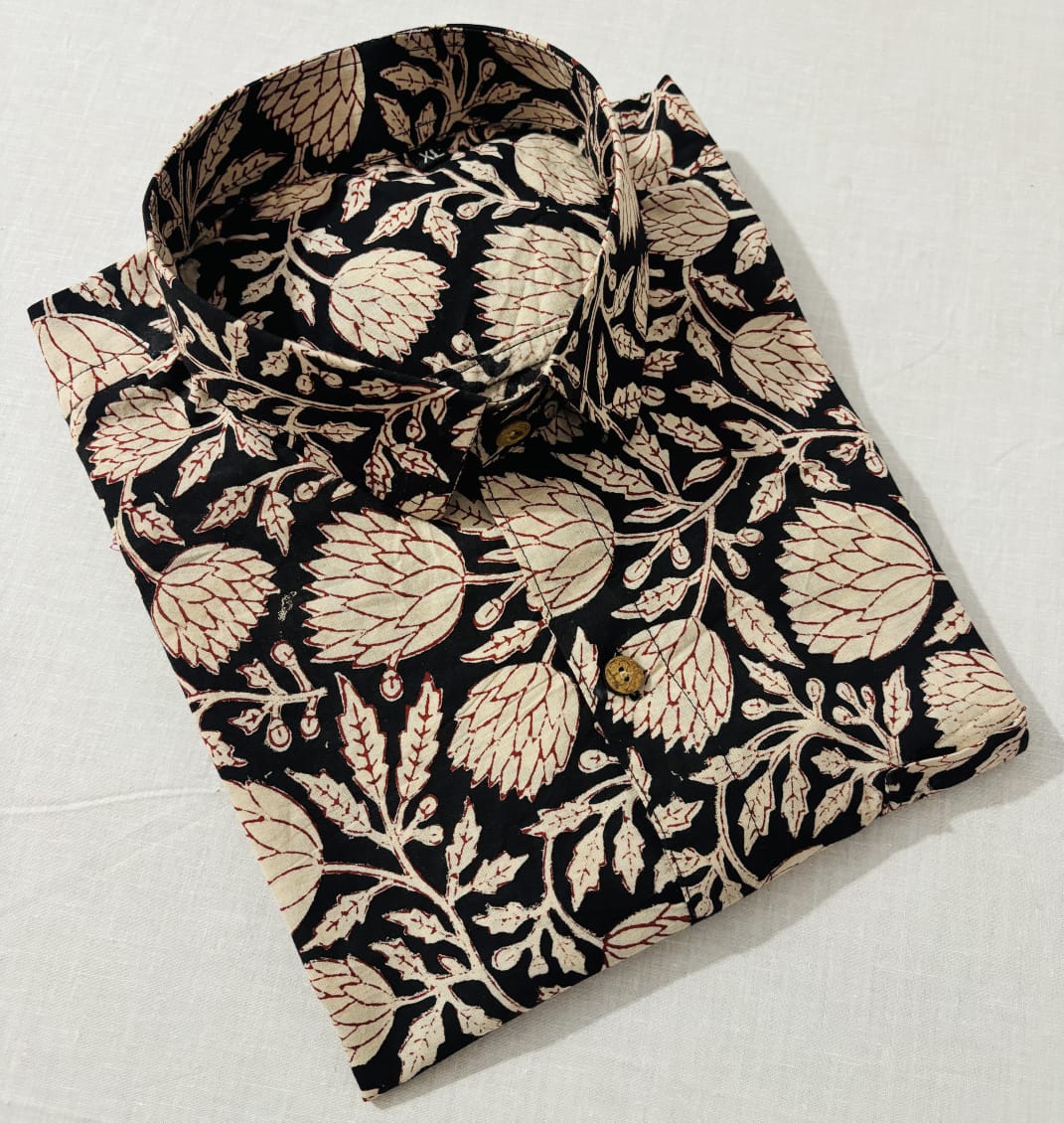 Cream Floral Bagru Block Cotton Men's Shirt XL