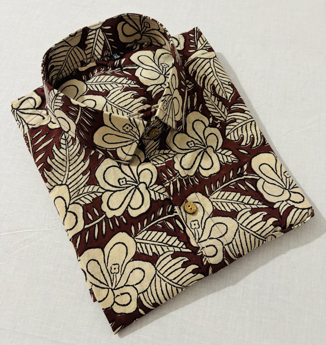 Experience the exquisite craftsmanship of traditional Indian artisans with our Cream Floral Bagru Block Cotton Shirt for Men. Hand block printed using the Bagru technique, this shirt features a tropical floral design on a rich dark brown base, perfect for adding a touch of ethnic charm to your wardrobe. Crafted from premium Cotton 60*60 Super Dying fabric, this shirt offers both style and comfort. The wooden buttons and classic collar add a touch of sophistication to the design. Embrace the artistry of hand block printing with this unique piece.