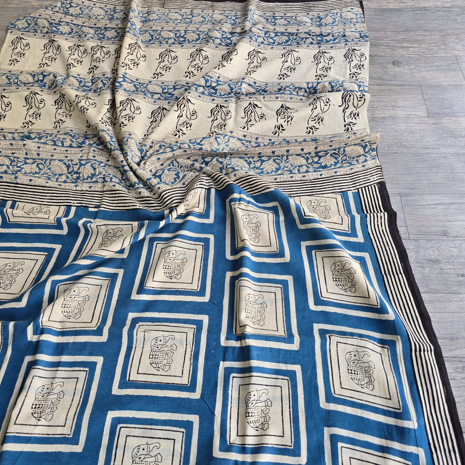 Experience the timeless elegance of hand block printing with our exquisite cotton mulmul saree. Crafted with precision and care, this saree features intricate floral and elephant motifs, bordered with striking stripes. The soft, breathable mulmul cotton ensures all-day comfort and style. Embrace the artistry of Indian craftsmanship with this premium piece from Blockart.